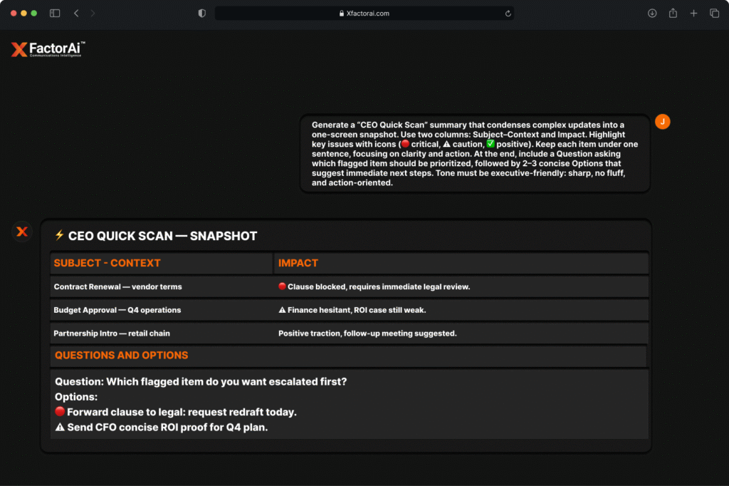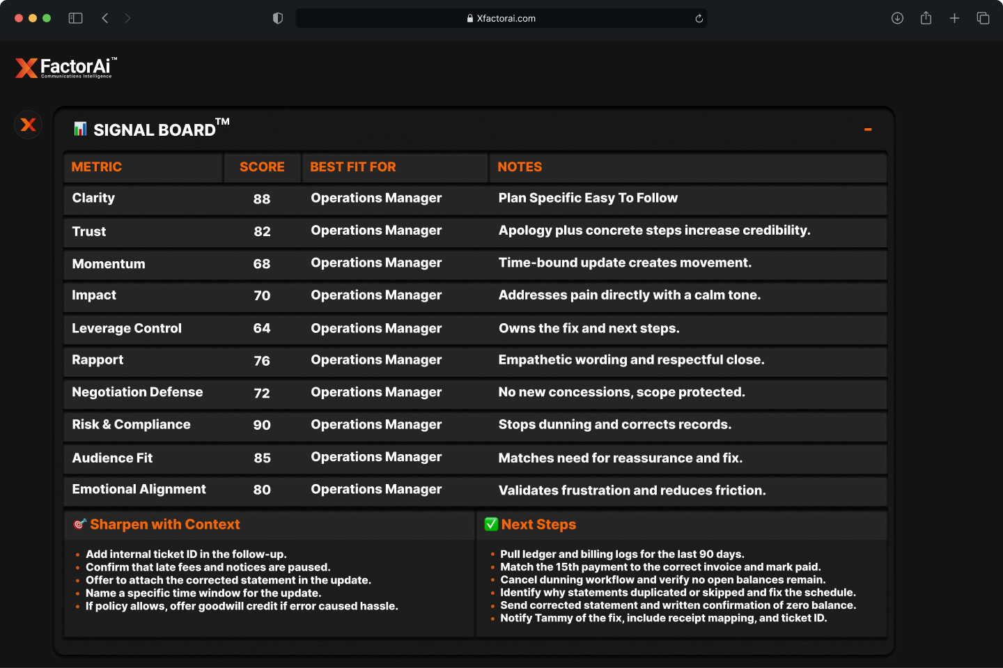 XFACTORAI™ is a COMMUNICATIONS INTELLIGENCE™ platform that analyzes, scores, and optimizes your messages in real time. It helps you understand tone, detect risk, and align your words with your goals — whether you’re closing a deal, leading a team, or managing sensitive conversations.