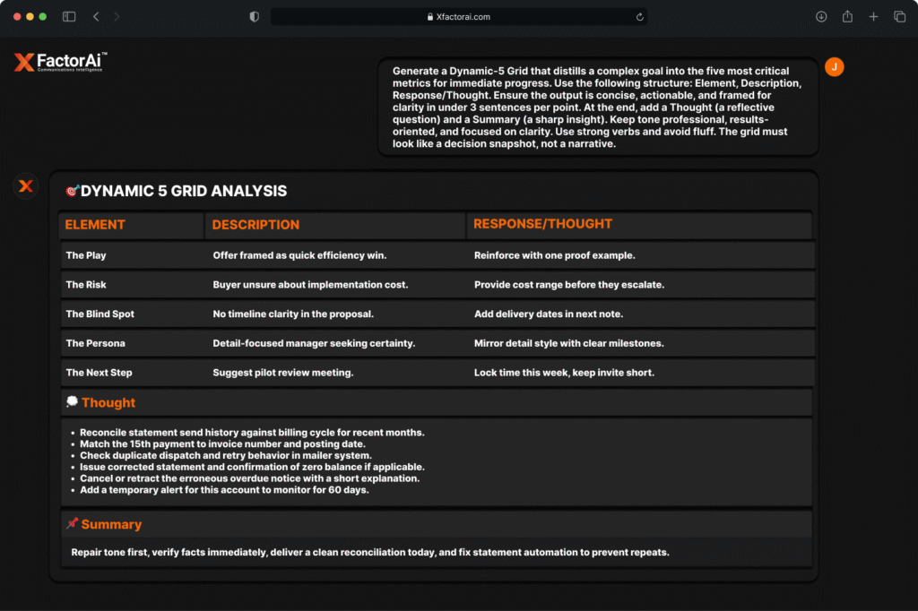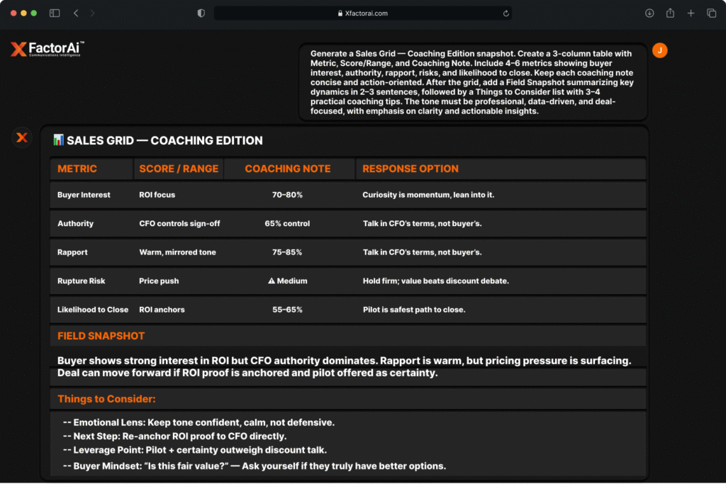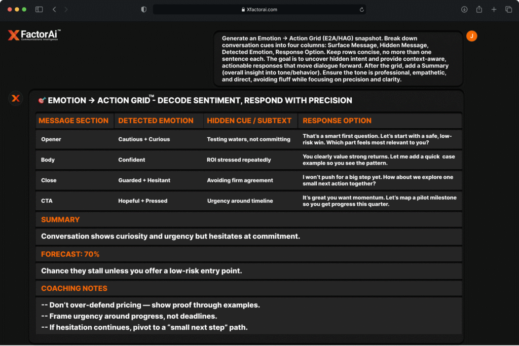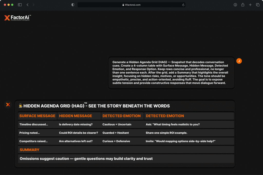 In business, every word is a decision driver. XFACTORAI™ transforms everyday communication into a strategic advantage with real‑time scoring, laser‑focused metric grids, executive‑ready summaries, sentiment‑to‑action mapping, hidden agenda detection, and sales‑stage alignment. From inbox to impact, you’ll know exactly what to say, how to say it, and why it will work.